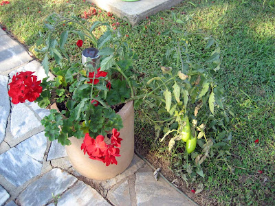Look carefully at this geranium pot...there are plum tomatoes growing with the geraniums. How delightful.